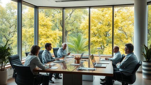 Группа людей обсуждает идеи в уютном офисном пространстве с зелеными растениями и художественной стеной.